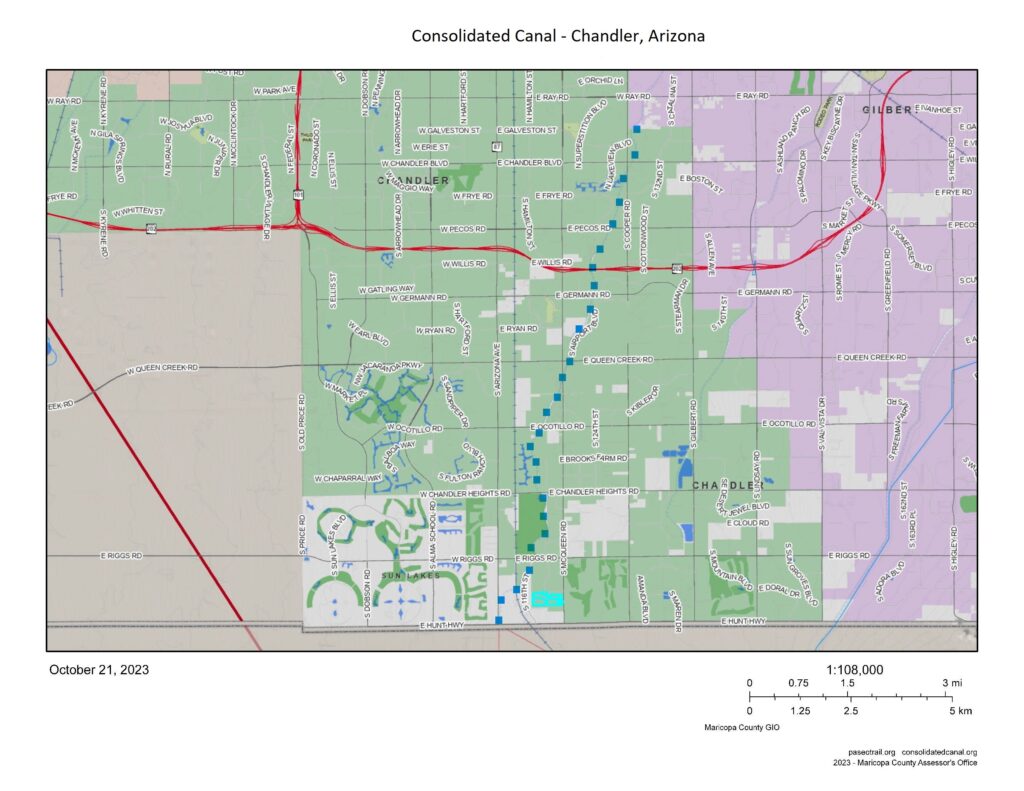 The Consolidated Canal project was started in 1891 by Dr. A.J. Chandler. The canal was purchased by the United States Government in 1908, and is one of eight canals in Maricopa County managed by the Salt River Project (SRP).