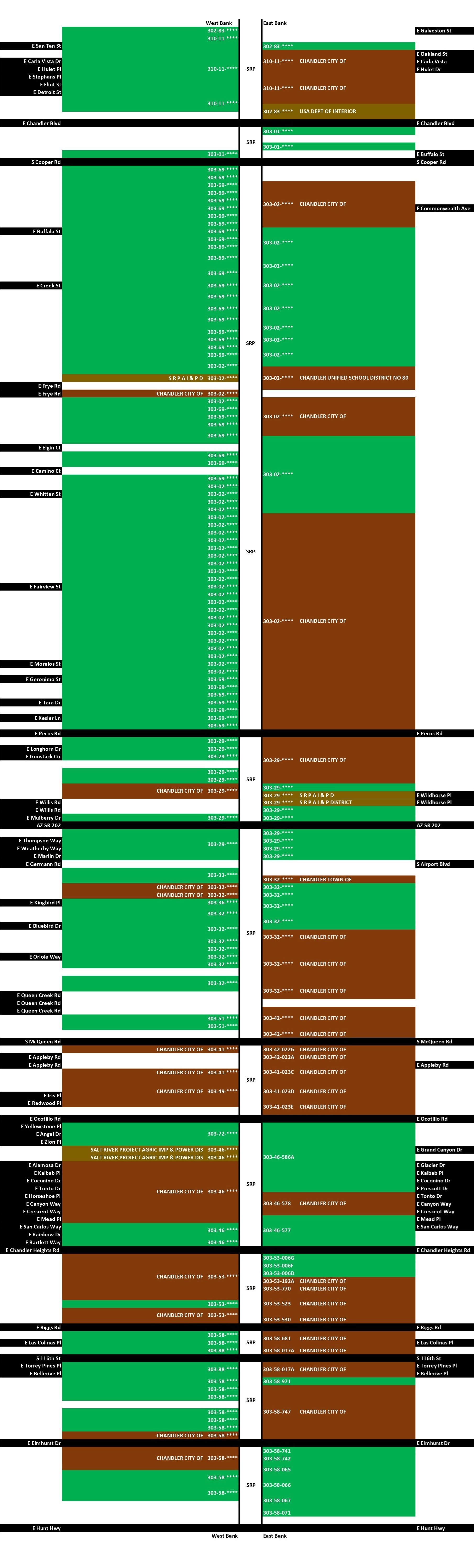 In the diagram below, the canal runs down the middle; parcels in green are privately owned; parcels in brown are City of Chandler; parcels in olive are US Government; unknown parcel numbers are not shown. Streets are black; through streets cross the canal; others stop at or before the adjacent properties. All locations are approximate and not to any scale.