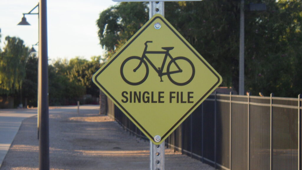 To clarify, I have asked the City of Chandler Streets department to put up advisory signs on Chandler Heights to alert drivers to ducks and geese crossing the street where the canal goes under the bridge. I was told that such an advisory sign is not standard, so the Street department will absolutely not do so. The sign that indicates bicycles must ride single file is not found the FHWA (Federal Highway Administration) MUTCD (Manual of Uniform Traffic Control Devices), so the Streets department would not have posted such a sign. Furthermore, ALL advisory signs must measure at least 18 inches (the single file sign does not). Finally, the east side of the Paseo Trail is neither a street, road, highway, etc., or a bike path (it’s a multi-use trail), so the sign surely was not posted by the Streets department, and is not an FHWA MUTCD advisory sign. Like all of the other signs posted on the Paseo Trail, it is a sign posted by Parks and Recreation that directs proper use of the City of Chandler facilities, subject to City of Chandler Municipal Code Chapter 31.