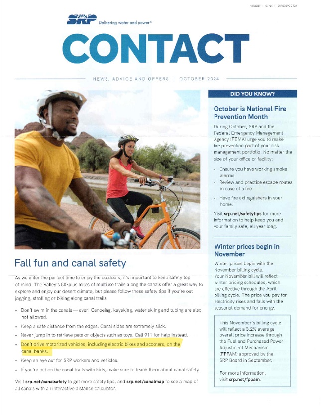 At the 17th Annual Chandler Family Bike Ride, while the website warned participants that e-bikes are prohibited on the canal, the announcer at the start of the ride could not bring herself to tell the truth. The announcements began with Mayor Hartke reminding everyone to ride safely, and then the unknown woman reminded e-bikes to ride them with power off while they are on the canal. As Mayor Hartke, members of City Council, Police Chief Chapman, and City Attorney Schwab are aware, the City of Chandler does not supersede Federal Law, and they are not entitled to mislead e-bike users that they may ride on the canal with power off – they have been told e-bikes are prohibited on the canal. Period.